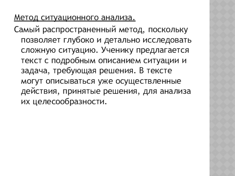 сложную ситуацию. Ученику предлагается текст с подробным описанием ситуации и задача, требующая решения. В тексте могут описываться уже осуществленные действия, принятые решения, для анализа их целесообразности.