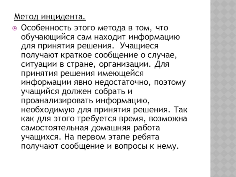 для принятия решения. Учащиеся получают краткое сообщение о случае, ситуации в стране, организации. Для принятия решения имеющейся информации явно недостаточно, поэтому учащийся должен собрать и проанализировать информацию, необходимую для принятия решения. Так как для этого требуется время, возможна самостоятельная домашняя работа учащихся. На первом этапе ребята получают сообщение и вопросы к нему.