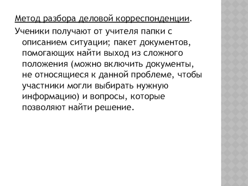 пакет документов, помогающих найти выход из сложного положения (можно включить документы, не относящиеся к данной проблеме, чтобы участники могли выбирать нужную информацию) и вопросы, которые позволяют найти решение.