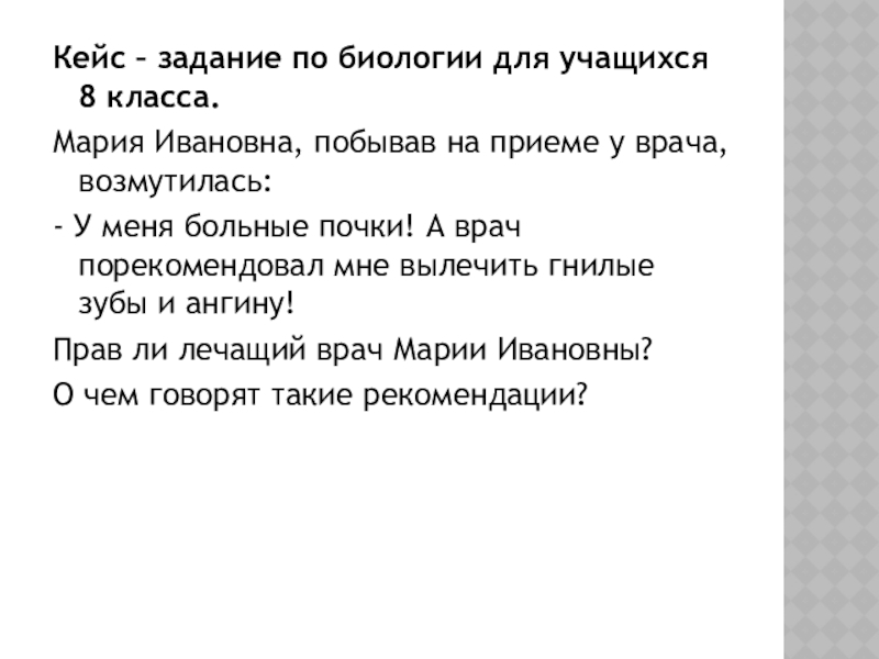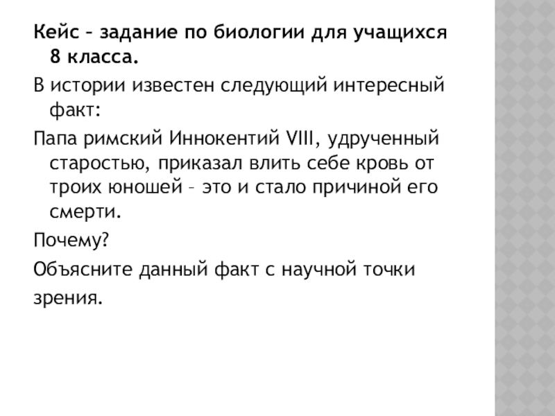 Слайд 15Кейс – задание по биологии для учащихся 8 класса.