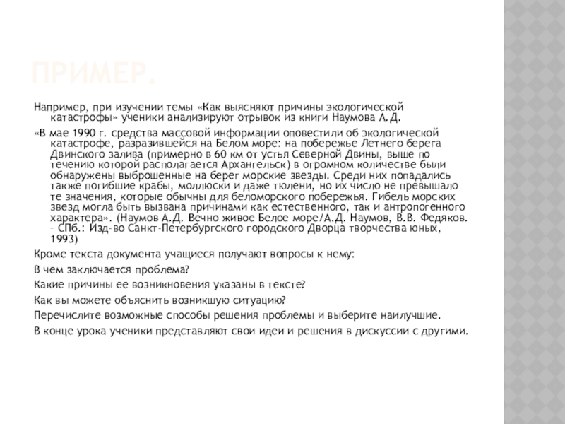 Например, при изучении темы «Как выясняют причины экологической катастрофы» ученики анализируют