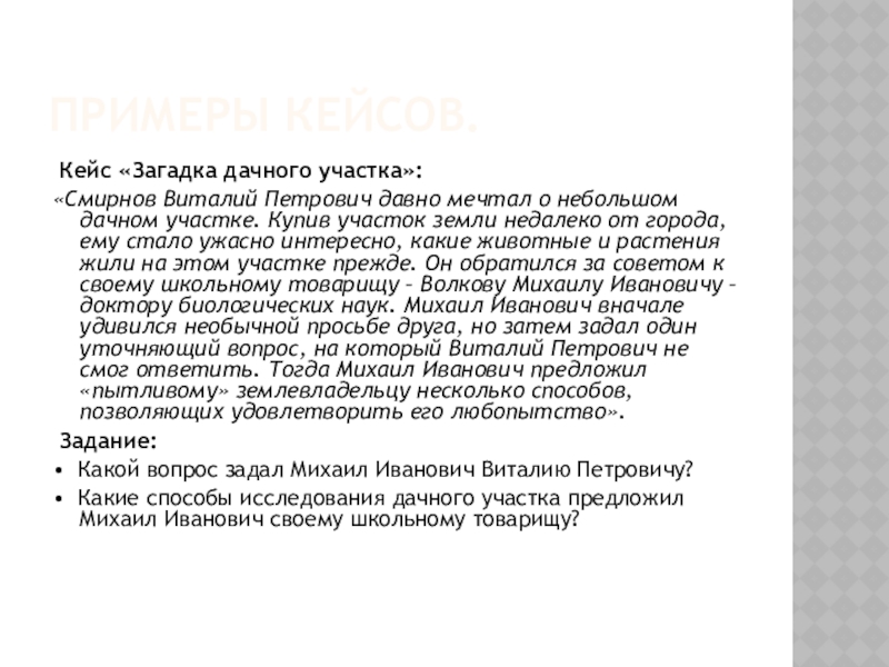 дачном участке. Купив участок земли недалеко от города, ему стало ужасно интересно, какие животные и растения жили на этом участке прежде. Он обратился за советом к своему школьному товарищу – Волкову Михаилу Ивановичу – доктору биологических наук. Михаил Иванович вначале удивился необычной просьбе друга, но затем задал один уточняющий вопрос, на который Виталий Петрович не смог ответить. Тогда Михаил Иванович предложил «пытливому» землевладельцу несколько способов, позволяющих удовлетворить его любопытство».