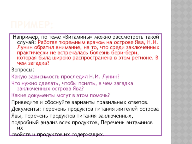 Например, по теме «Витамины» можно рассмотреть такой случай: Работая тюремным врачом