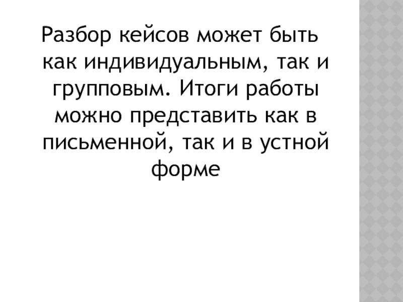 Слайд 16Разбор кейсов может быть как индивидуальным, так и групповым. Итоги работы
