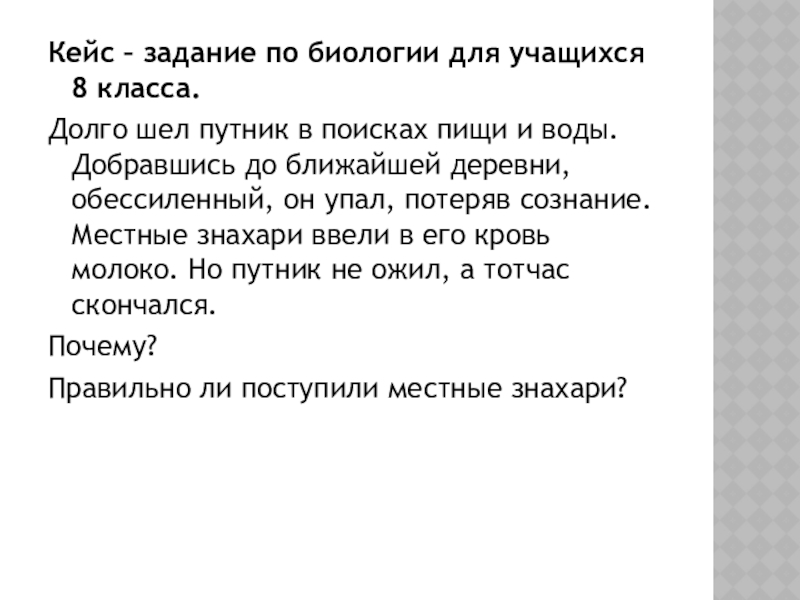 Слайд 12Кейс – задание по биологии для учащихся 8 класса.