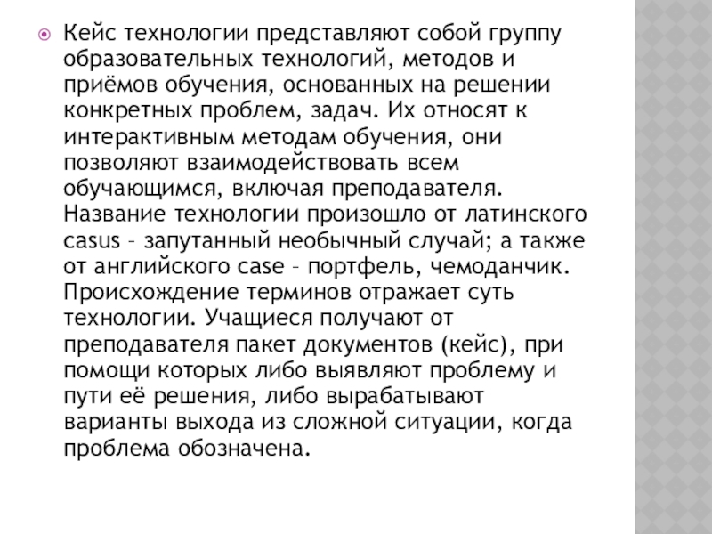основанных на решении конкретных проблем, задач. Их относят к интерактивным методам обучения, они позволяют взаимодействовать всем обучающимся, включая преподавателя. Название технологии произошло от латинского casus – запутанный необычный случай; а также от английского case – портфель, чемоданчик. Происхождение терминов отражает суть технологии. Учащиеся получают от преподавателя пакет документов (кейс), при помощи которых либо выявляют проблему и пути её решения, либо вырабатывают варианты выхода из сложной ситуации, когда проблема обозначена.