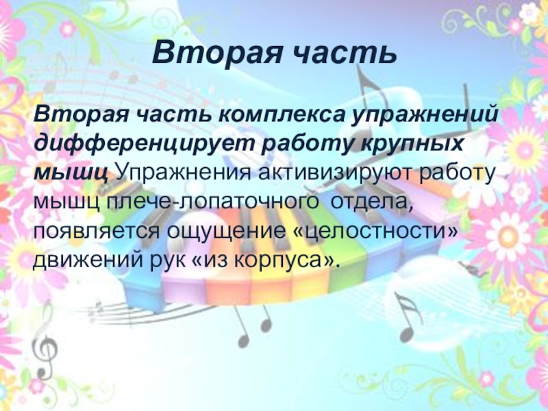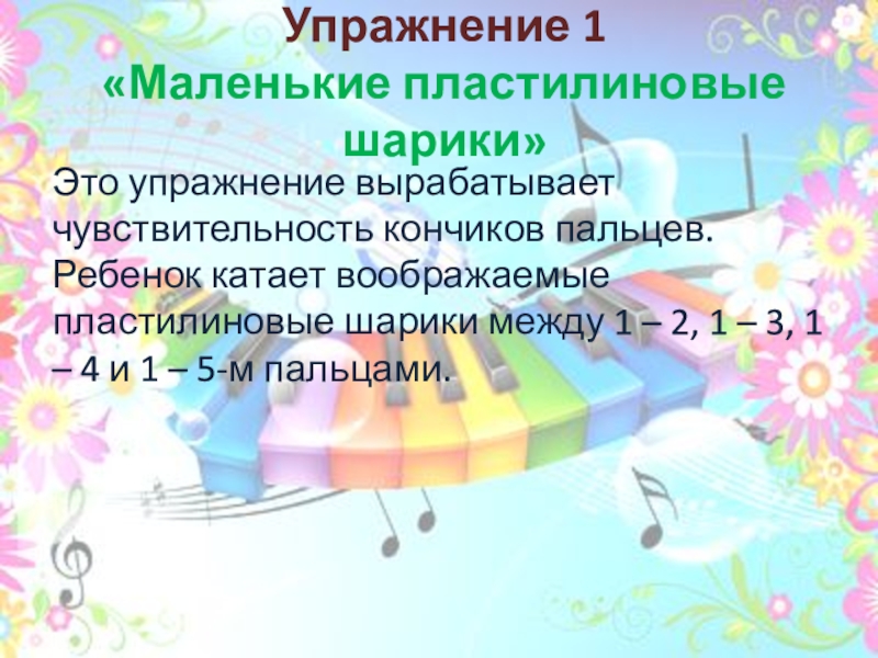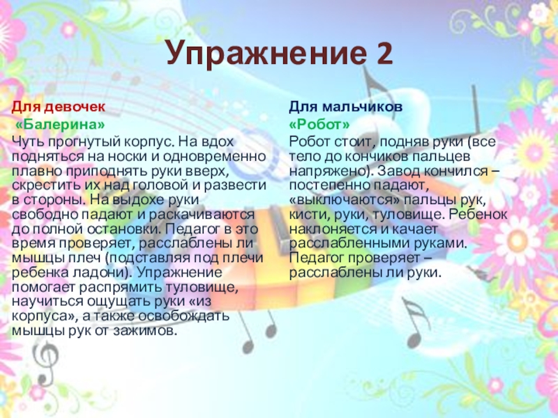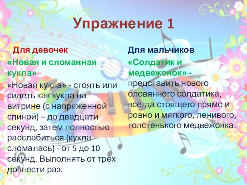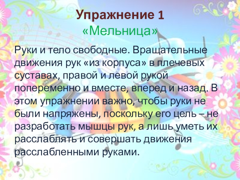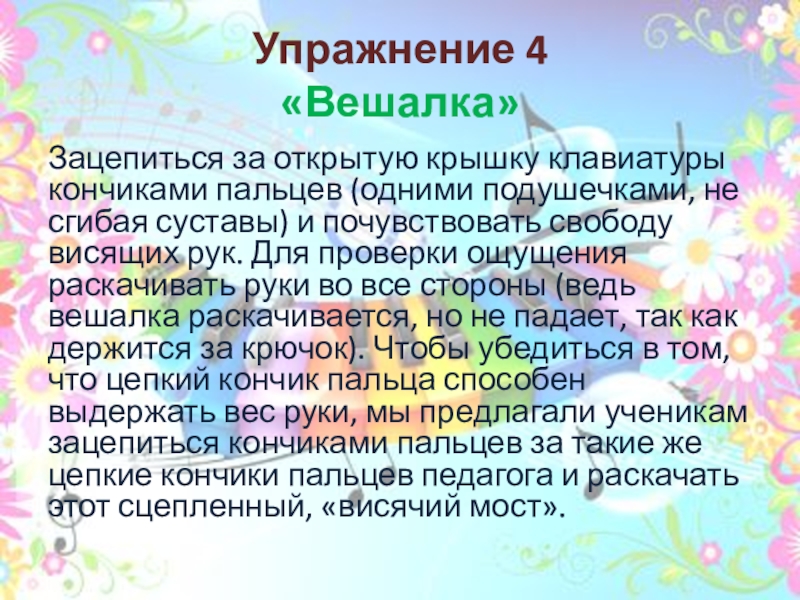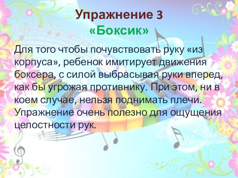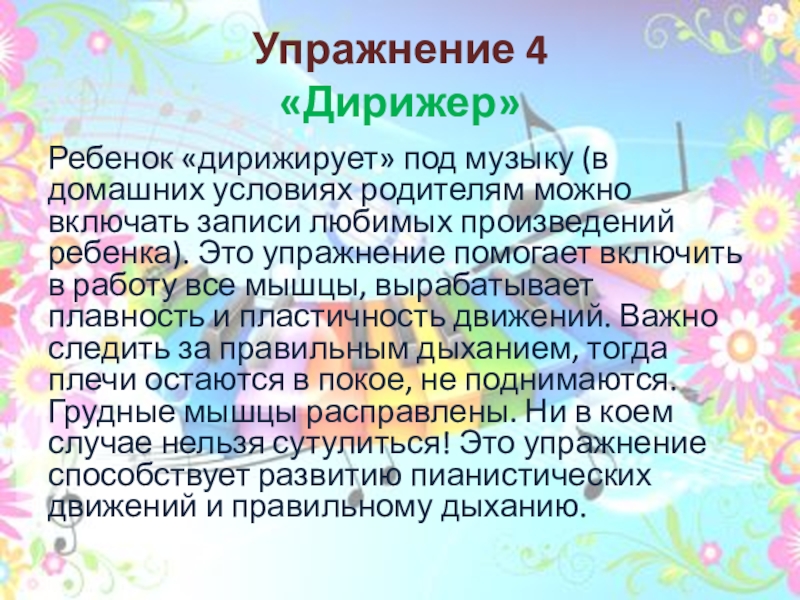 записи любимых произведений ребенка). Это упражнение помогает включить в работу все мышцы, вырабатывает плавность и пластичность движений. Важно следить за правильным дыханием, тогда плечи остаются в покое, не поднимаются. Грудные мышцы расправлены. Ни в коем случае нельзя сутулиться! Это упражнение способствует развитию пианистических движений и правильному дыханию.