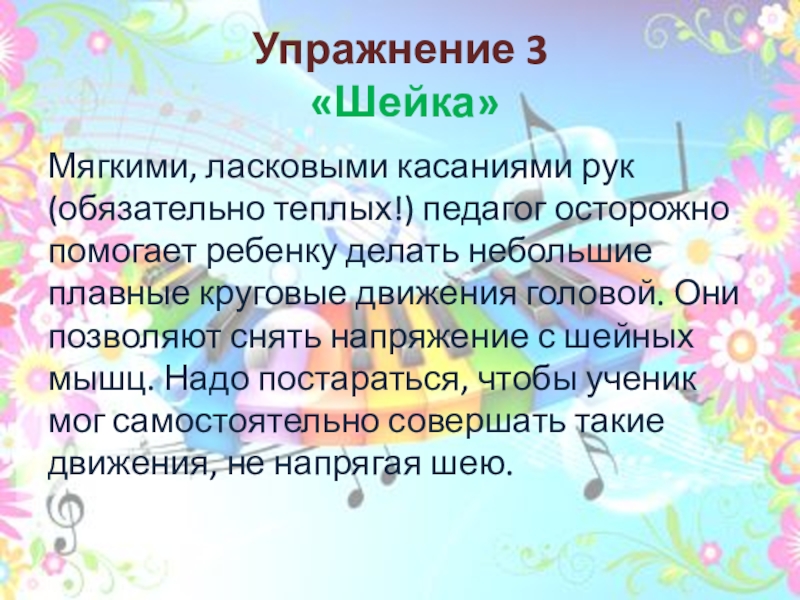 делать небольшие плавные круговые движения головой. Они позволяют снять напряжение с шейных мышц. Надо постараться, чтобы ученик мог самостоятельно совершать такие движения, не напрягая шею.
