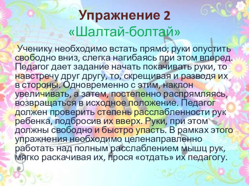 при этом вперед. Педагог дает задание начать покачивать руки, то навстречу друг другу, то, скрещивая и разводя их в стороны. Одновременно с этим, наклон увеличивать, а затем, постепенно распрямляясь, возвращаться в исходное положение. Педагог должен проверить степень расслабленности рук ребенка, подбросив их вверх. Руки, при этом должны свободно и быстро упасть. В рамках этого упражнения необходимо целенаправленно работать над полным расслаблением мышц рук, мягко раскачивая их, прося «отдать» их педагогу.
