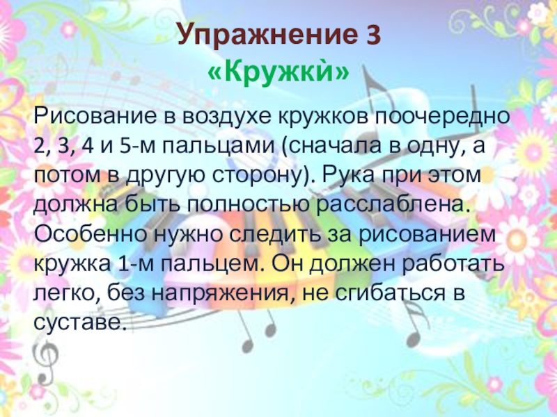 пальцами (сначала в одну, а потом в другую сторону). Рука при этом должна быть полностью расслаблена. Особенно нужно следить за рисованием кружка 1-м пальцем. Он должен работать легко, без напряжения, не сгибаться в суставе.