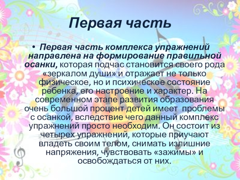 подчас становится своего рода «зеркалом души» и отражает не только физическое, но и психическое состояние ребенка, его настроение и характер. На современном этапе развития образования очень большой процент детей имеет проблемы с осанкой, вследствие чего данный комплекс упражнений просто необходим. Он состоит из четырех упражнений, которые приучают владеть своим телом, снимать излишние напряжения, чувствовать «зажимы» и освобождаться от них.