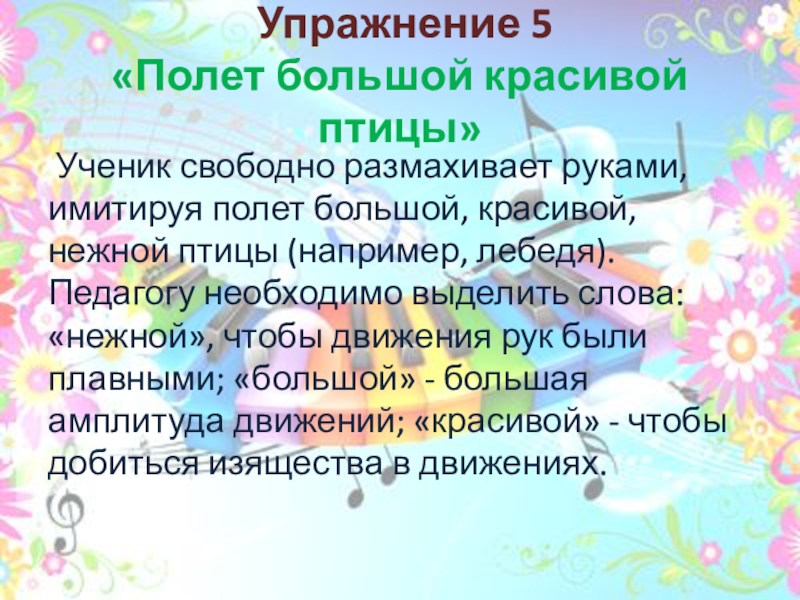 большой, красивой, нежной птицы (например, лебедя). Педагогу необходимо выделить слова: «нежной», чтобы движения рук были плавными; «большой» - большая амплитуда движений; «красивой» - чтобы добиться изящества в движениях.