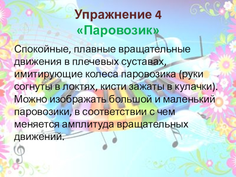 паровозика (руки согнуты в локтях, кисти зажаты в кулачки). Можно изображать большой и маленький паровозики, в соответствии с чем меняется амплитуда вращательных движений.
