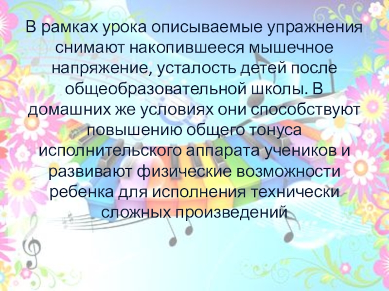 после общеобразовательной школы. В домашних же условиях они способствуют повышению общего тонуса исполнительского аппарата учеников и развивают физические возможности ребенка для исполнения технически сложных произведений