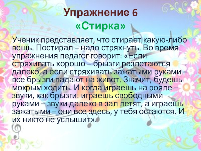 стряхнуть. Во время упражнения педагог говорит: «Если стряхивать хорошо – брызги разлетаются далеко, а если стряхивать зажатыми руками – все брызги падают на живот. Значит, будешь мокрым ходить. И когда играешь на рояле – звуки, как брызги: играешь свободными руками – звуки далеко в зал летят, а играешь зажатыми – они все здесь, у тебя остаются. И их никто не услышит».