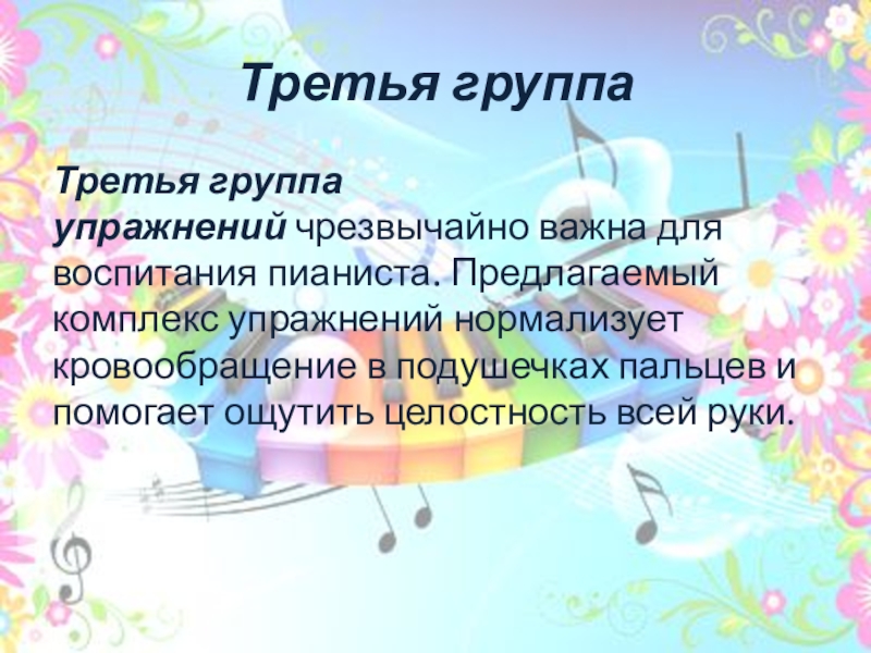 Третья группа упражнений чрезвычайно важна для воспитания пианиста. Предлагаемый комплекс упражнений