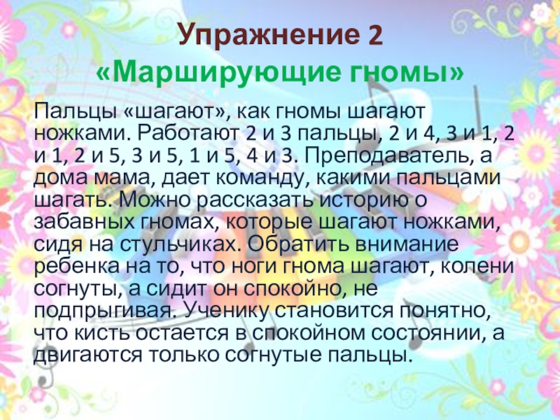 3 пальцы, 2 и 4, 3 и 1, 2 и 1, 2 и 5, 3 и 5, 1 и 5, 4 и 3. Преподаватель, а дома мама, дает команду, какими пальцами шагать. Можно рассказать историю о забавных гномах, которые шагают ножками, сидя на стульчиках. Обратить внимание ребенка на то, что ноги гнома шагают, колени согнуты, а сидит он спокойно, не подпрыгивая. Ученику становится понятно, что кисть остается в спокойном состоянии, а двигаются только согнутые пальцы.