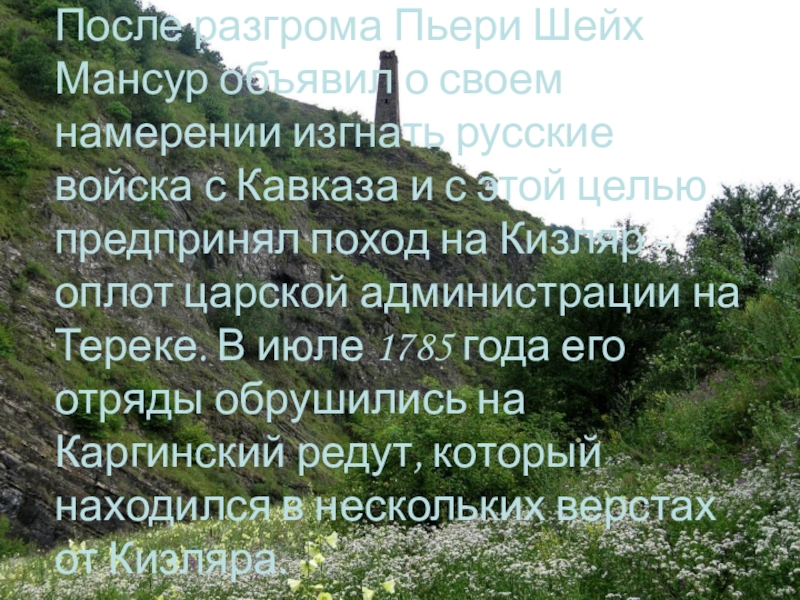 Слайд 37После разгрома Пьери Шейх Мансур объявил о своем намерении изгнать русские