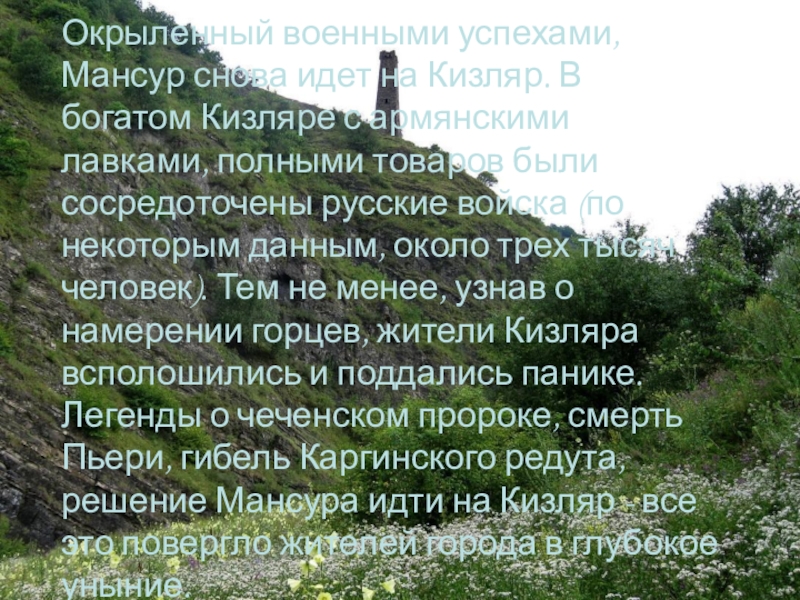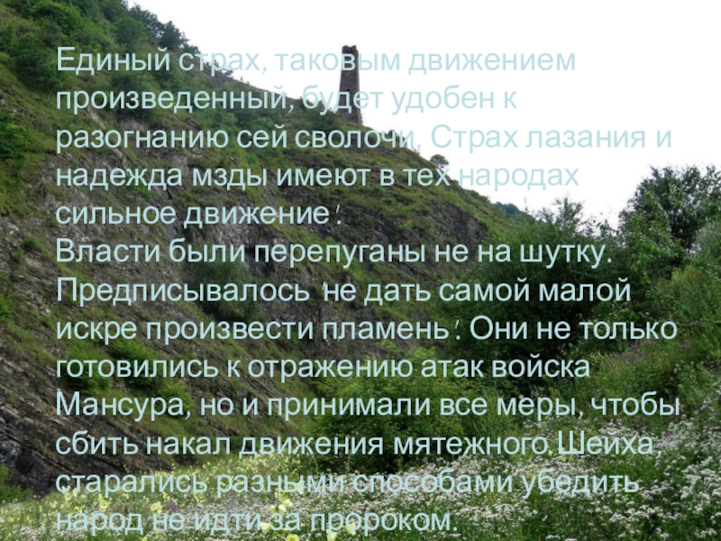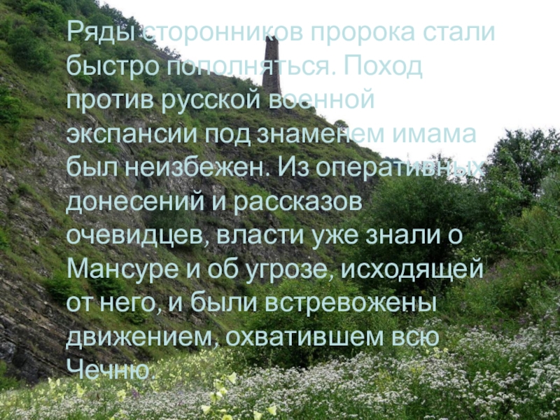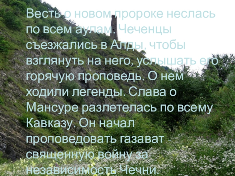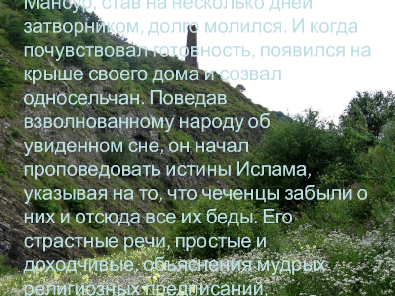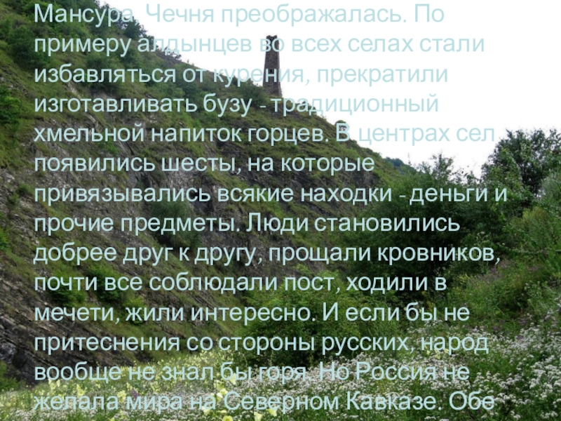Слайд 36В это время, под влиянием проповедей Мансура, Чечня преображалась. По примеру