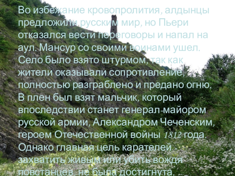 переговоры и напал на аул. Мансур со своими воинами ушел. Село было взято штурмом, так как жители оказывали сопротивление, полностью разграблено и предано огню. В плен был взят мальчик, который впоследствии станет генерал-майором русской армии, Александром Чеченским, героем Отечественной войны 1812 года. Однако главная цель карателей - захватить живым или убить вождя повстанцев, не была достигнута.