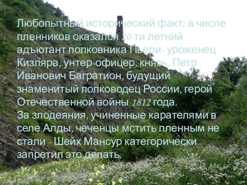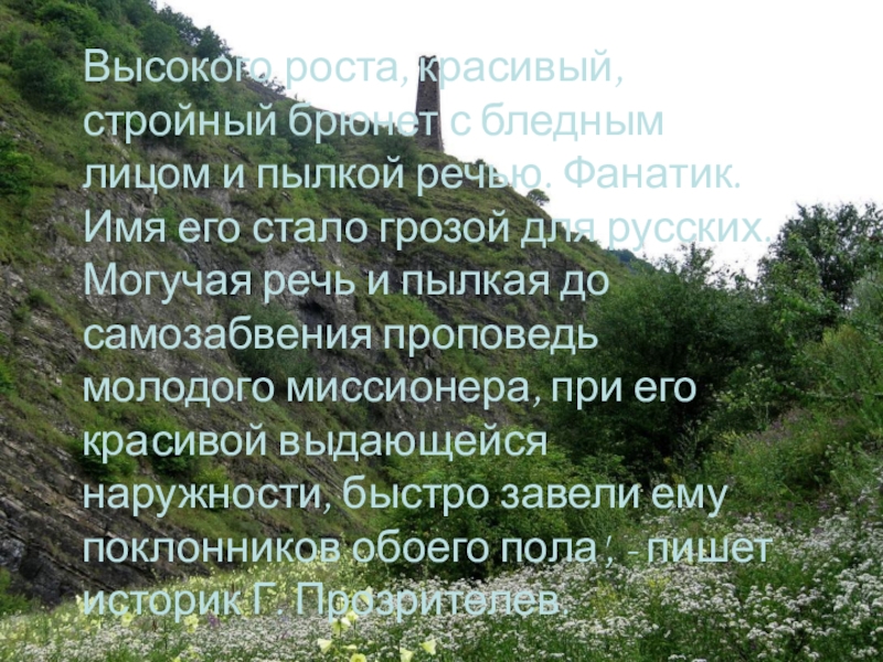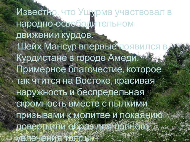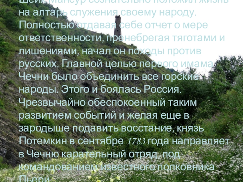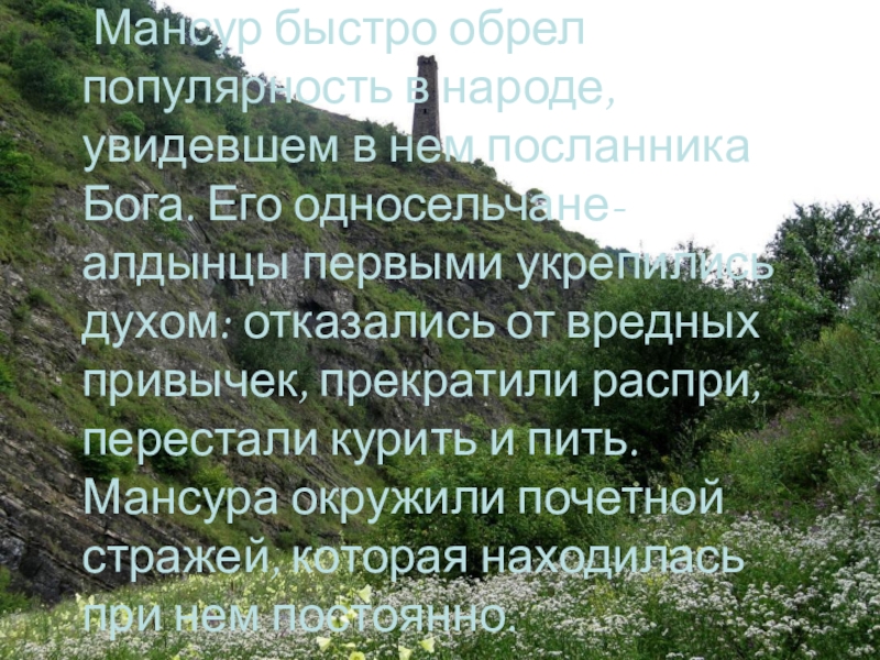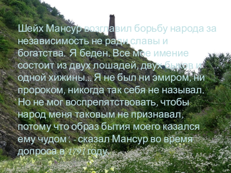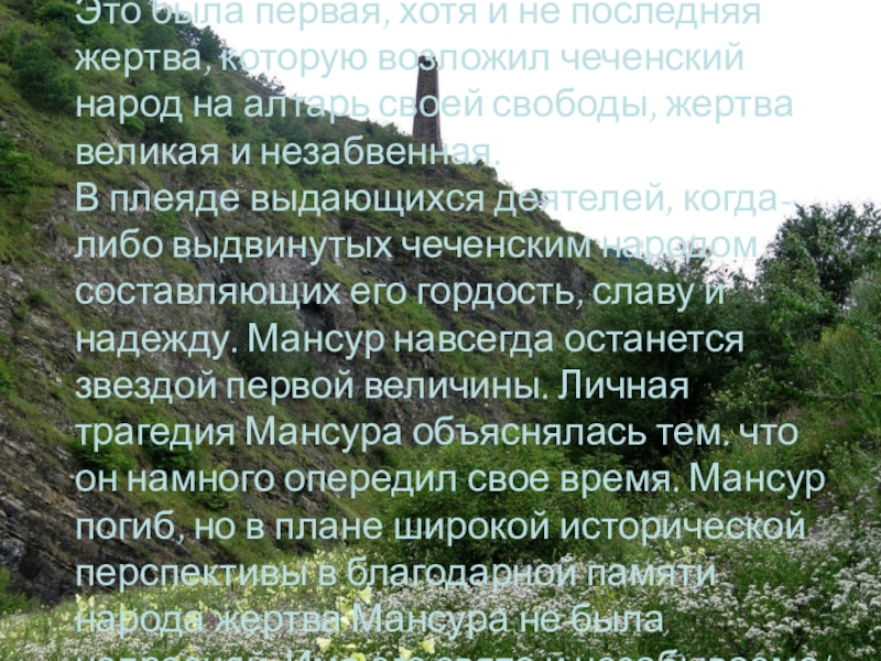 Слайд 27Шейх Мансур сознательно положил жизнь на алтарь служения своему народу. Полностью