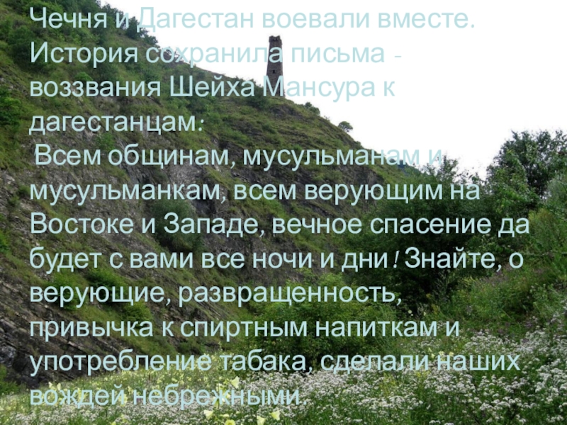 Слайд 14Чечня и Дагестан воевали вместе. История сохранила письма - воззвания Шейха