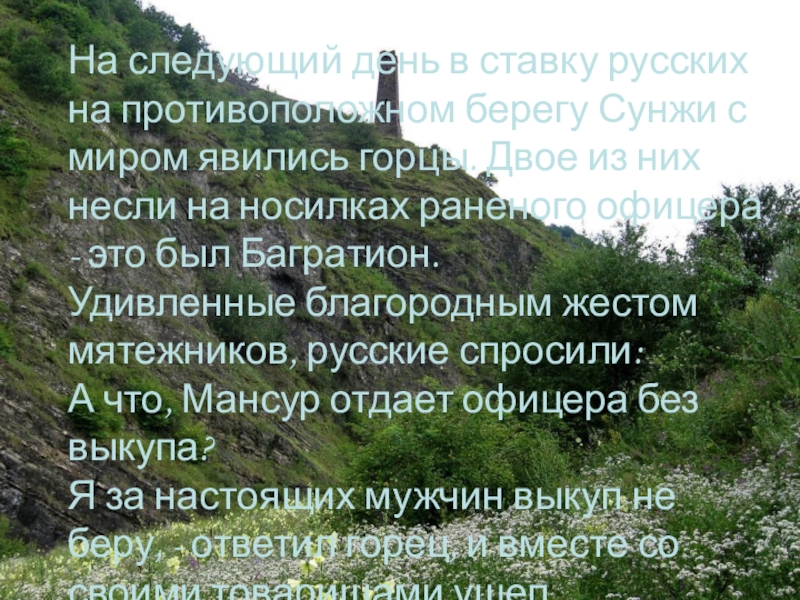миром явились горцы. Двое из них несли на носилках раненого офицера - это был Багратион.