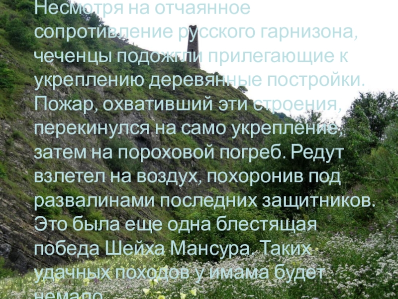 Слайд 38Несмотря на отчаянное сопротивление русского гарнизона, чеченцы подожгли прилегающие к укреплению