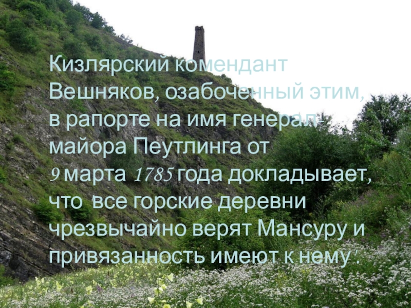 9 марта 1785 года докладывает, что 'все горские деревни чрезвычайно верят Мансуру и привязанность имеют к нему'.