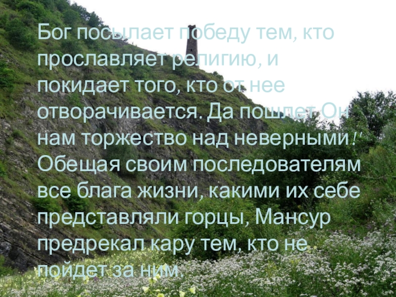 Обещая своим последователям все блага жизни, какими их себе представляли горцы, Мансур предрекал кару тем, кто не пойдет за ним.
