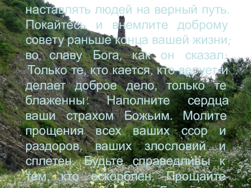 и внемлите доброму совету раньше конца вашей жизни; во славу Бога, как он сказал: 'Только те, кто кается, кто верует и делает доброе дело, только те блаженны'. Наполните сердца ваши страхом Божьим. Молите прощения всех ваших ссор и раздоров, ваших злословий и сплетен. Будьте справедливы к тем, кто оскорблен. Прощайте преступников во славу Бога.