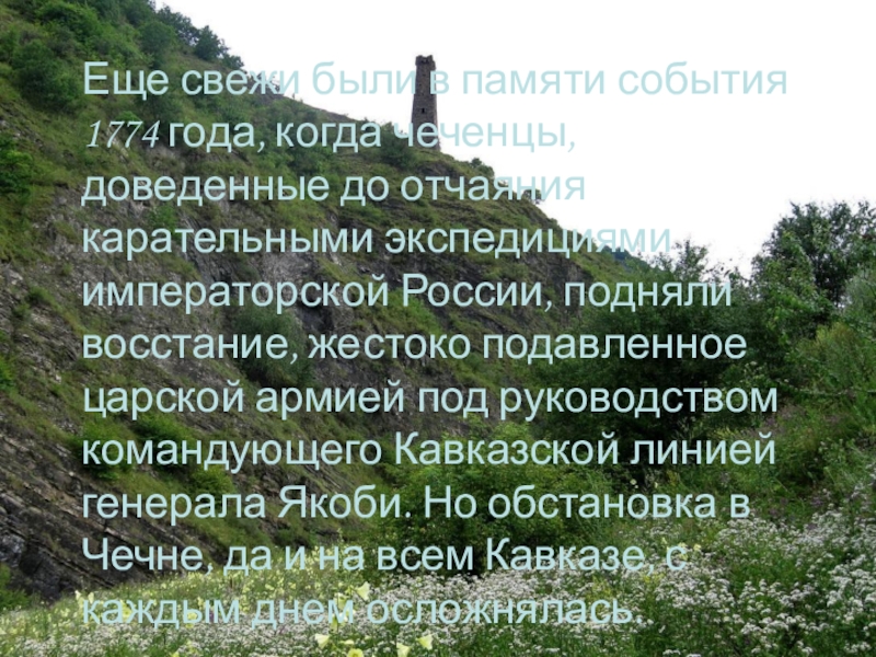 Слайд 7Еще свежи были в памяти события 1774 года, когда чеченцы, доведенные