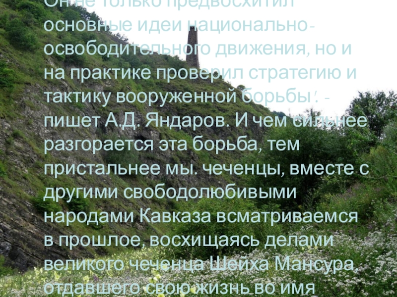 практике проверил стратегию и тактику вооруженной борьбы'. - пишет А.Д. Яндаров. И чем сильнее разгорается эта борьба, тем пристальнее мы. чеченцы, вместе с другими свободолюбивыми народами Кавказа всматриваемся в прошлое, восхищаясь делами великого чеченца Шейха Мансура, отдавшего свою жизнь во имя нашей свободы.