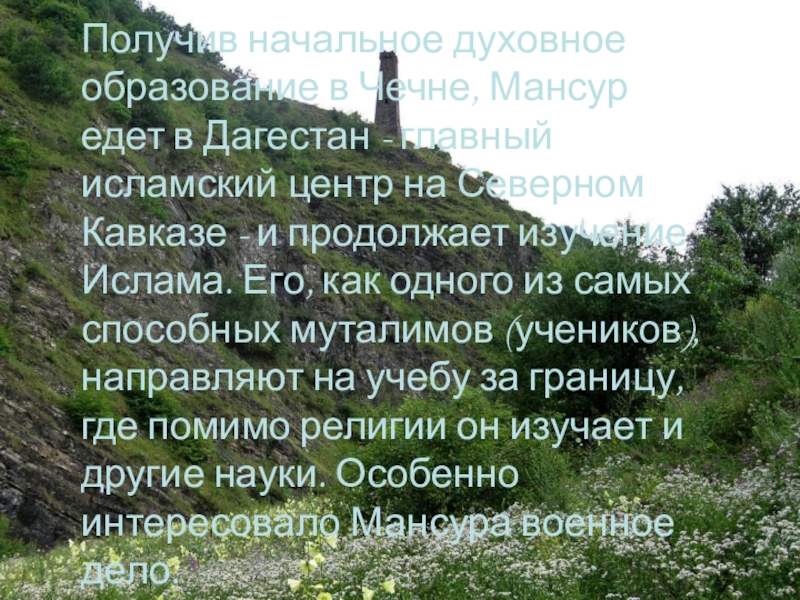 Слайд 4Получив начальное духовное образование в Чечне, Мансур едет в Дагестан -
