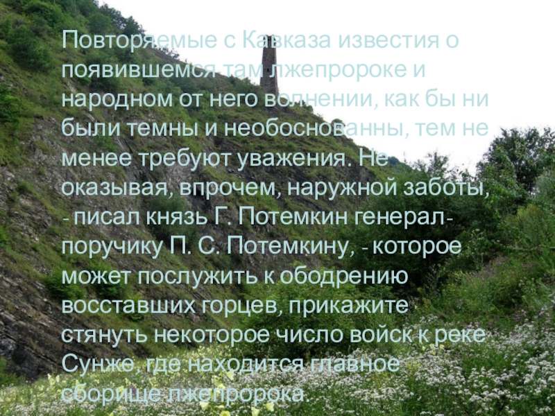 него волнении, как бы ни были темны и необоснованны, тем не менее требуют уважения. Не оказывая, впрочем, наружной заботы, - писал князь Г. Потемкин генерал-поручику П. С. Потемкину, - которое может послужить к ободрению восставших горцев, прикажите стянуть некоторое число войск к реке Сунже, где находится главное сборище лжепророка.