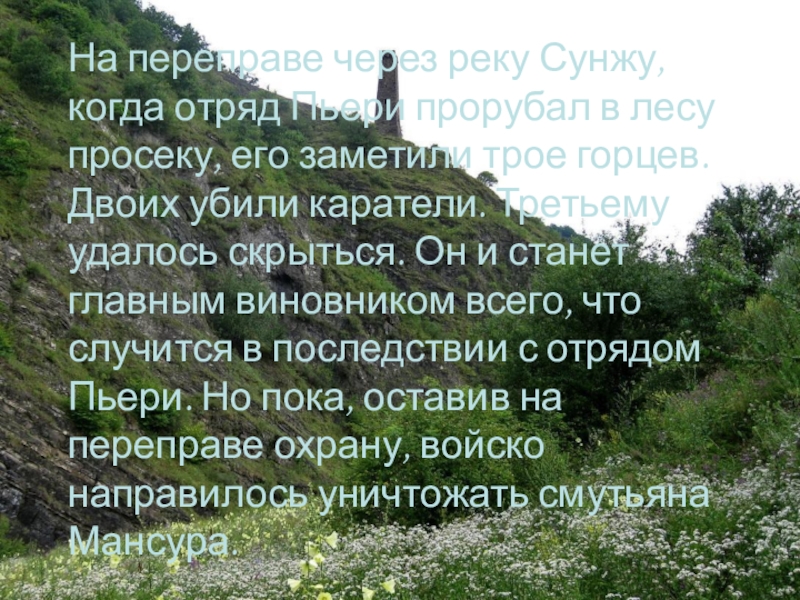 просеку, его заметили трое горцев. Двоих убили каратели. Третьему удалось скрыться. Он и станет главным виновником всего, что случится в последствии с отрядом Пьери. Но пока, оставив на переправе охрану, войско направилось уничтожать смутьяна Мансура.