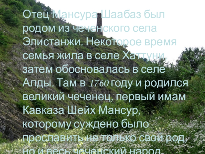 Слайд 2Отец Мансура Шаабаз был родом из чеченского села Элистанжи. Некоторое время