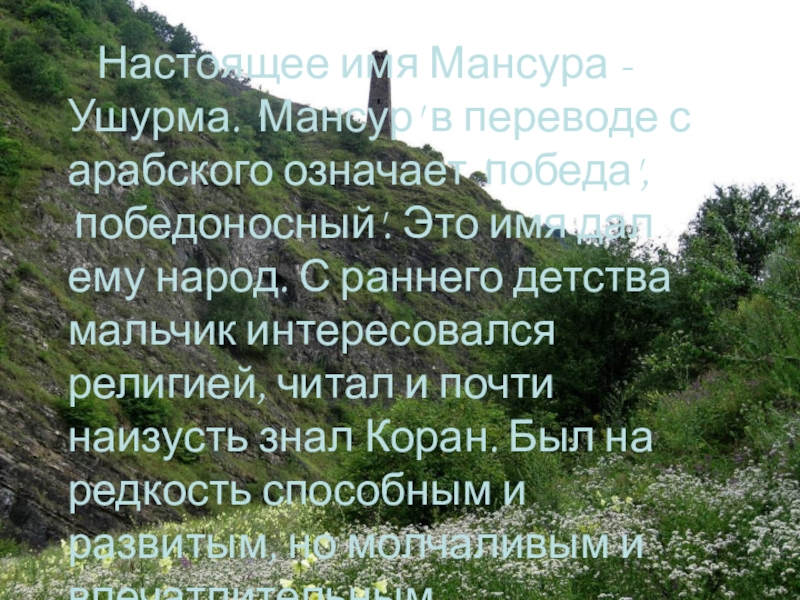 Слайд 3 Настоящее имя Мансура - Ушурма. 'Мансур' в переводе с арабского означает