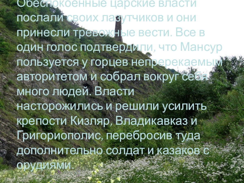 Все в один голос подтвердили, что Мансур пользуется у горцев непререкаемым авторитетом и собрал вокруг себя много людей. Власти насторожились и решили усилить крепости Кизляр, Владикавказ и Григориополис, перебросив туда дополнительно солдат и казаков с орудиями.
