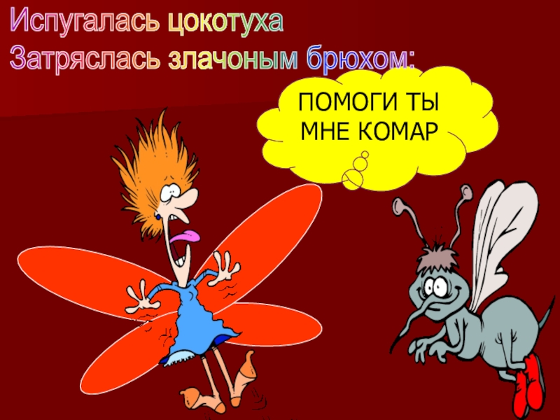 ПОМОГИ ТЫ МНЕ КОМАРИспугалась цокотуха  Затряслась злачоным брюхом: