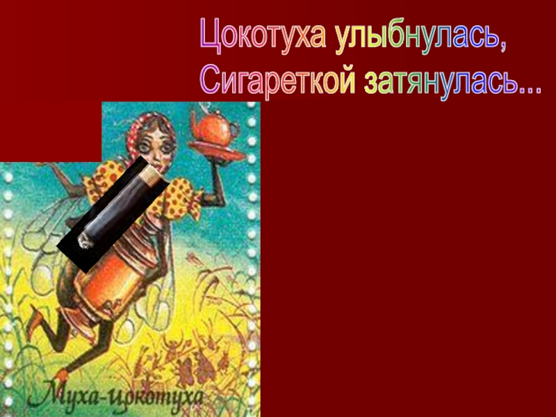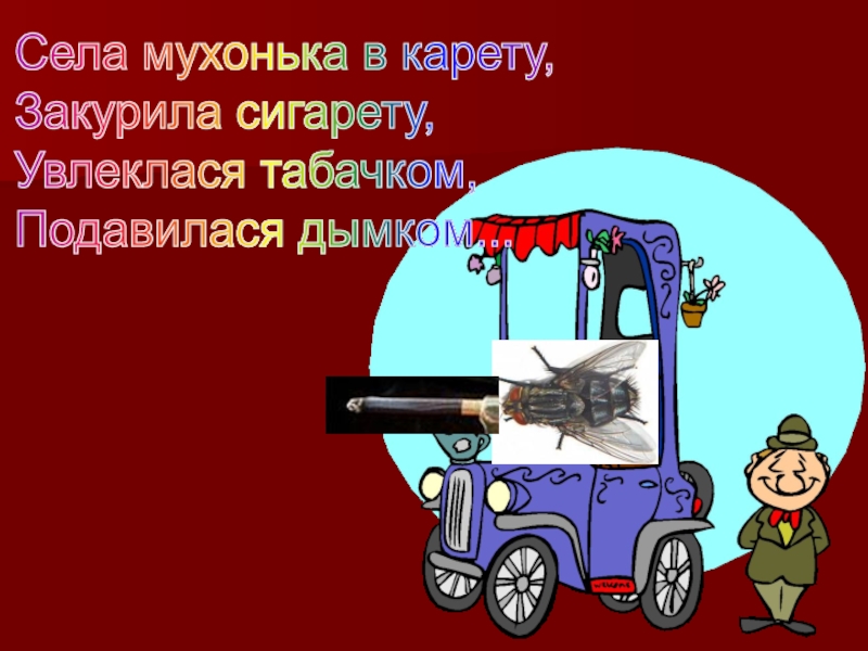 Слайд 4Села мухонька в карету, Закурила сигарету, Увлеклася табачком, Подавилася дымком...
