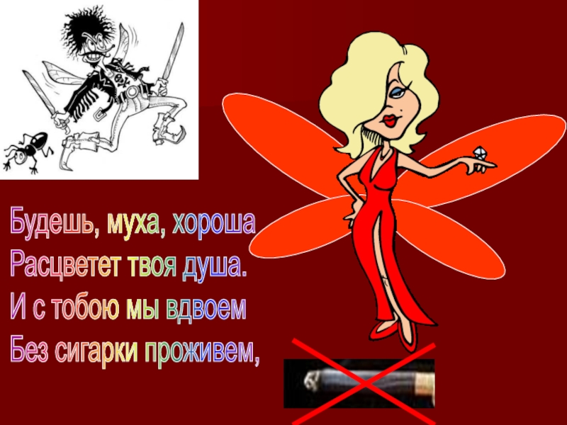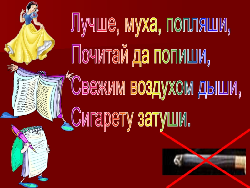 Слайд 11Лучше, муха, попляши, Почитай да попиши, Свежим воздухом дыши, Сигарету затуши.