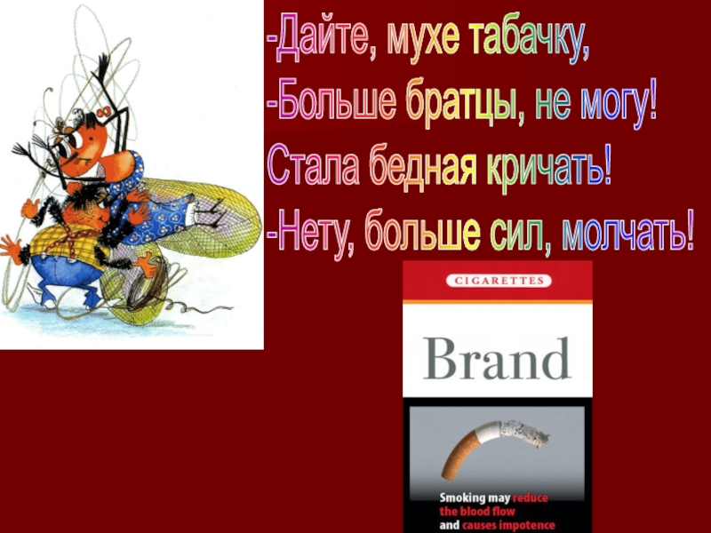 Слайд 9-Дайте, мухе табачку, -Больше братцы, не могу! Стала бедная кричать! -Нету,