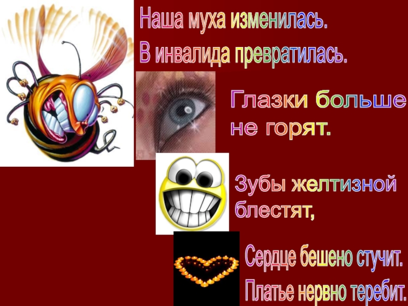 Наша муха изменилась.  В инвалида превратилась.Глазки больше  не горят.Зубы желтизной  блестят,Сердце бешено стучит.