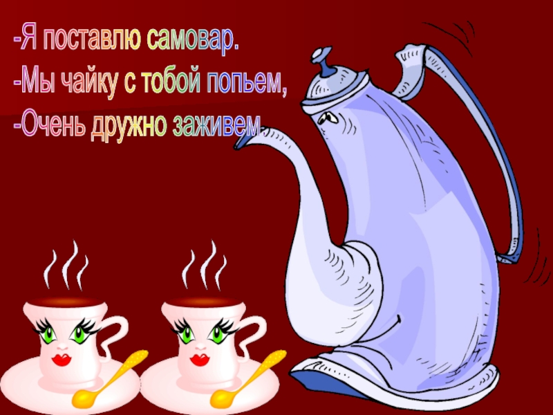 Слайд 16-Я поставлю самовар. -Мы чайку с тобой попьем, -Очень дружно заживем.