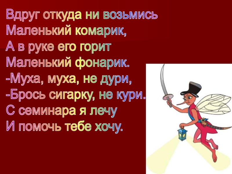 Маленький фонарик. -Муха, муха, не дури, -Брось сигарку, не кури. С семинара я лечу И помочь тебе хочу.