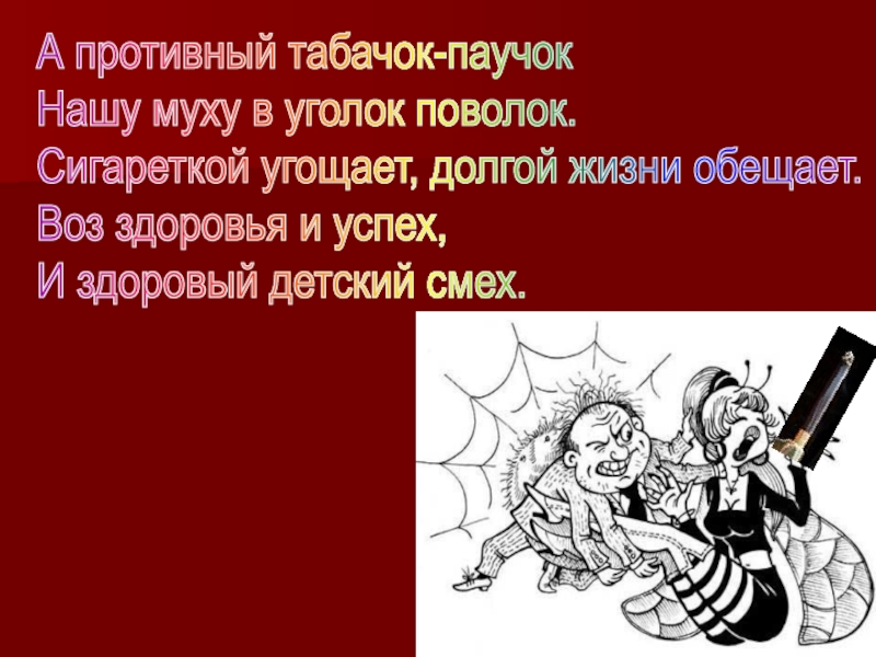 Слайд 5А противный табачок-паучок Нашу муху в уголок поволок. Сигареткой угощает, долгой