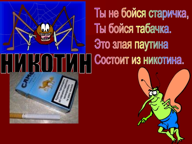НИКОТИН Ты не бойся старичка,  Ты бойся табачка.  Это злая паутина  Состоит из никотина.