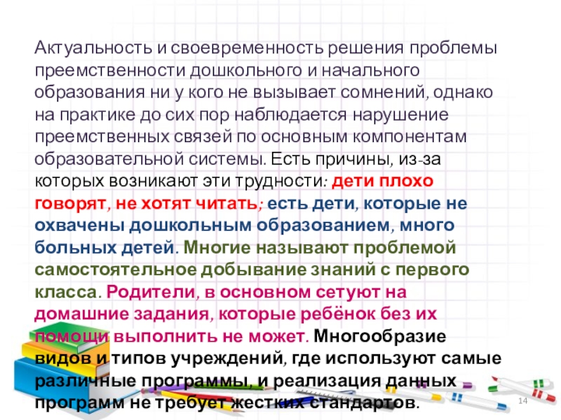 Актуальность и своевременность решения проблемы преемственности дошкольного и начального образования ни
