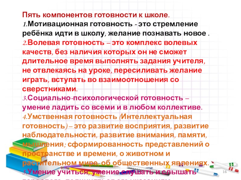 2.Волевая готовность – это комплекс волевых качеств, без наличия которых он не сможет длительное время выполнять задания учителя, не отвлекаясь на уроке, пересиливать желание играть, вступать во взаимоотношения со сверстниками.